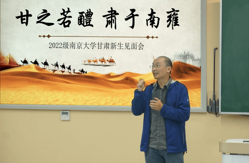 甘肃招生组的老师们也为同学们送上了温情寄语。徐慨老师鼓励同学们以更加开放的心态来面对新的城市、新的学习环境和新的成长路径,在努力进行“学习线”的同时,利用好南大的平台和资源来寻找“职业线”,以此来锚定人生方向,增强精神动力;同为甘肃老乡的商琳老师为同学们分享了在南京可以找到的家乡美味,并从专业角度风趣地讲述了水一定要和电脑分离、重要资料至少应该备份3份等建议;牛克昌老师用家乡方言与大家亲切交流,提醒大家应及时调整心态开启新的学习篇章,既要主动发掘“独特性”,找到自己与众不同的发展路径,也要铭记家乡的精神之根,不能忘本;王蕾老师则叮嘱大家在往前走的同时别忘记关心父母,要常和父母联系,与父母多沟通多交流。