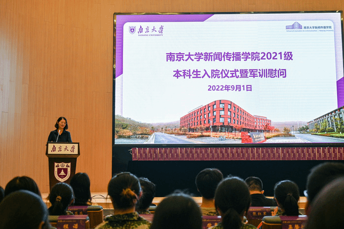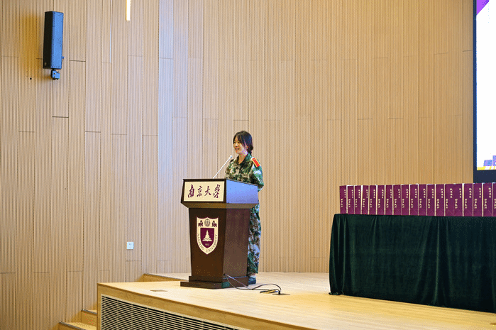 2021级本科学生代表李欣怡同学,结合十几天的军训经历,分享了自己正式成为南大新传人的收获和体悟。同时,她也无比感谢在过去一年的学习生活中,学院老师们给予21级同学的热切关怀和用心引领,为大家打开了新闻传播学的大门。最后,她勉励同学们,不忘初心,继续前进,在学院老师的教育培养下,握好手中的笔,在未来更大的舞台上讲好中国故事,与时偕行,奔赴山海,共同书写壮丽的篇章。
