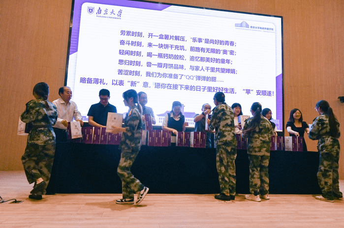 接下来是军训慰问环节,伴随着活泼的音乐声,同学们依次上台领取学院精心准备的慰问品。