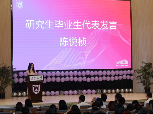 随后,2021届研究生毕业生代表陈悦桢同学上台发言。她提到,从2014年到2021年,自己在色情网站