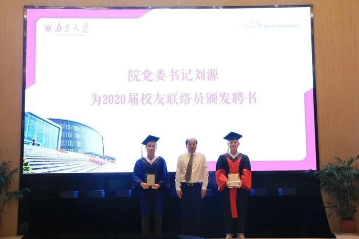 毕业之后同学们就有了一个新的身份——南大新传校友。为了进一步做好校友工作,学院从2020届毕业生中选聘了一位本科校友联络员。院党委书记刘源为2020届校友联络员彭越颁发聘书。