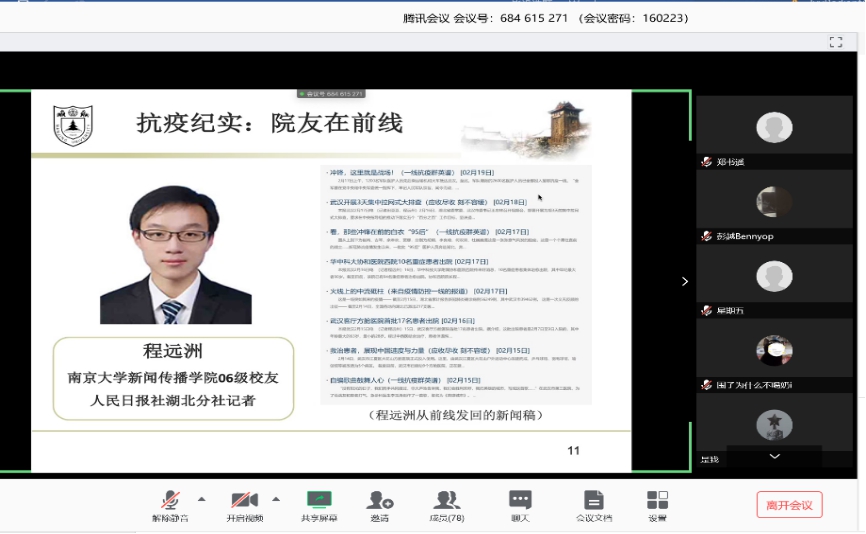 2006级校友、人民日报社湖北分社记者程远州的先进事迹。作为最早关注和报道武汉疫情的记者之一,程远州校友已经在武汉抗疫采访第一线坚守了50余天,他用冲锋在前的初心使命和责任担当,更加坚定了学弟学妹们抗击疫情必胜的信念。