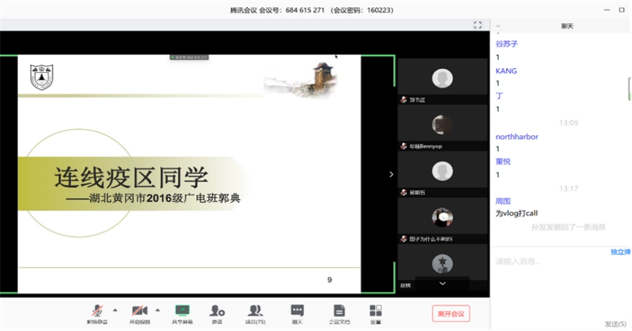 在网络会议室,大家连线了身处湖北家中的多位同学。他们讲述了近段时间的所见所闻,老师和同学也表达了对他们的慰问和关心,期盼着大家能够早日返回校园一起学习生活。