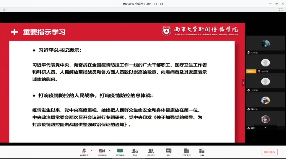 2016级、2017级、2018级三个年级分别组织开展同心战“疫”·“新”火相传线上主题班会,坚定信心决心,强化责任担当,教育引导新传学子理性看待、正确对待疫情,深刻领悟爱国主义的时代内涵、自强不息的民族精神以及集中力量办大事的制度优势。