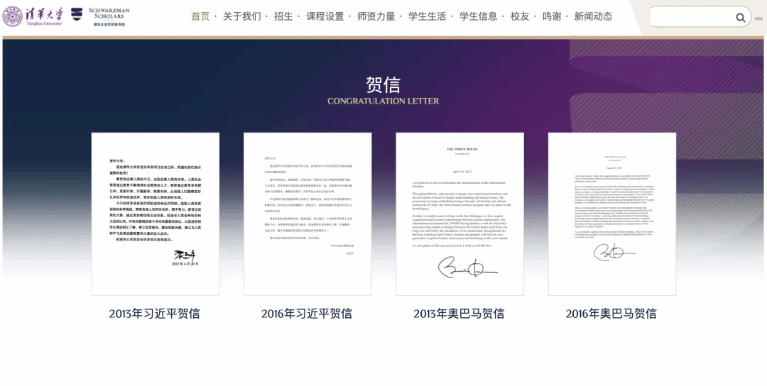 清华大学苏世民书院秉承“立足中国、面向世界”的原则,是清华大学专门为未来世界的领导者持续提升全球领导力而精心设计的硕士项目。作为清华大学新百年发展的重点举措,书院自创建伊始即得到全球各界领导者的关注和支持。中国国家主席习近平和时任美国总统奥巴马分别两次发来贺信,祝贺苏世民学者项目启动以及首届苏世民学者入学。