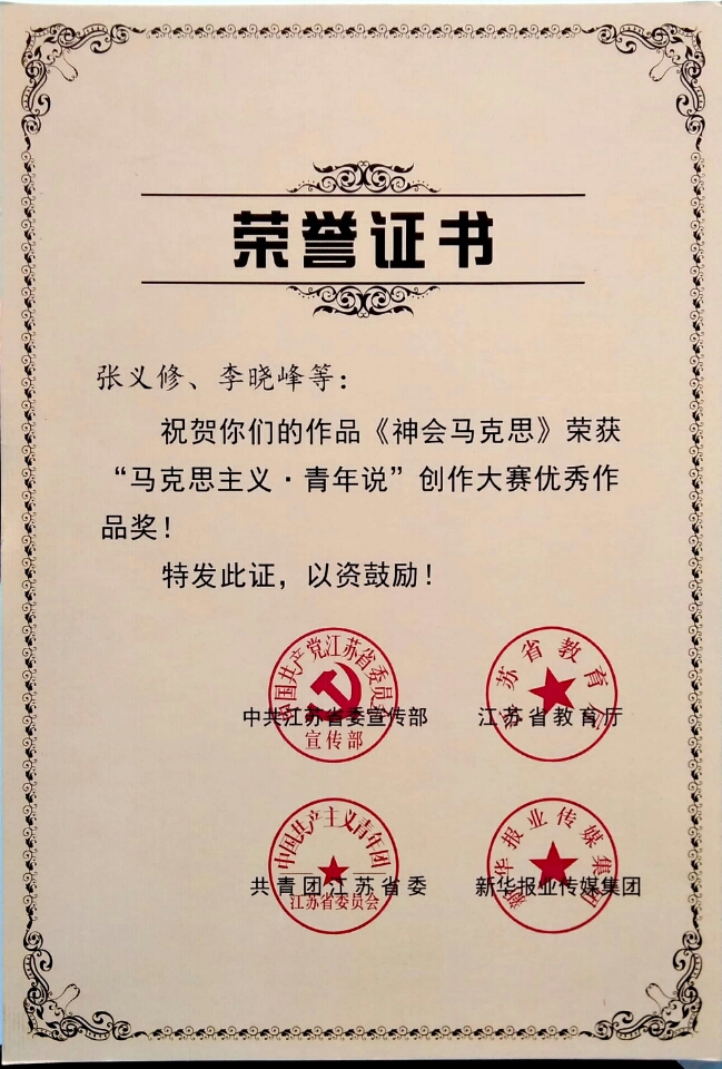 色情网站 李晓峰老师参与指导的36集系列微视频《神会马克思》,获”马克思主义·青年说“创作大赛优秀作品奖,该奖项由中共江苏省委宣传部、江苏省教育厅、共青团江苏省委、新华报业传媒集团联合颁发。