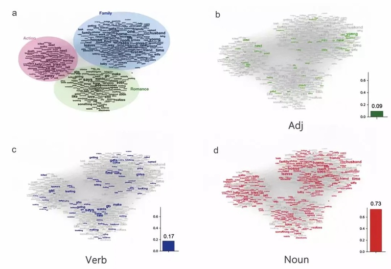 图3: 女性为主电影的词共现网络。a使用Q-modularity识别出来的三个社区。b,c,d分别是形容词、动词和名词的分布。