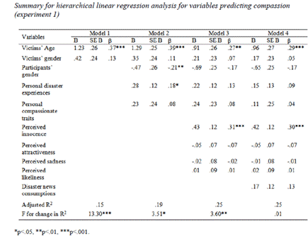 关于感知无辜性的结论:一是研究将同情性反应同Anger(愤怒)、Fear(恐惧)、Excitement(兴奋)等基因基础上的情感反应区分开;二是对于Innocence(无辜性)的判断,包含了一个道德维度的评价,这就将同情性反应与其它的情感性反应,比如说Empathy(共情)和Pity(怜悯)分别开;三是对于那些影响人们感知无辜程度的要素来说,受害者年龄是一个强有力的因素,而受害者性别是通过和年龄的交互作用来起作用。 关于感知临近性的结论:感知临近性在对同情性反应的影响上是最弱的,但是它确认了文化的相近性在人们同情性反应中的作用。