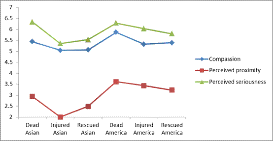 根据第二组实验得出结果(如下图所示):1、在感知临近性方面(红线),被试者(美国学生)会认为美国人更近,亚洲人更远;2、在感知严重性方面(绿线),被试者对于死亡的同情反应超越了种族:面对不同种族和不同面孔,被试者会认为死者都是最值得同情的;3、高度相似的三条感知曲线展现出典型的族群内部认同特征:在每一个族群内部,死者是最值得同情的,然后是受伤者和获救者。