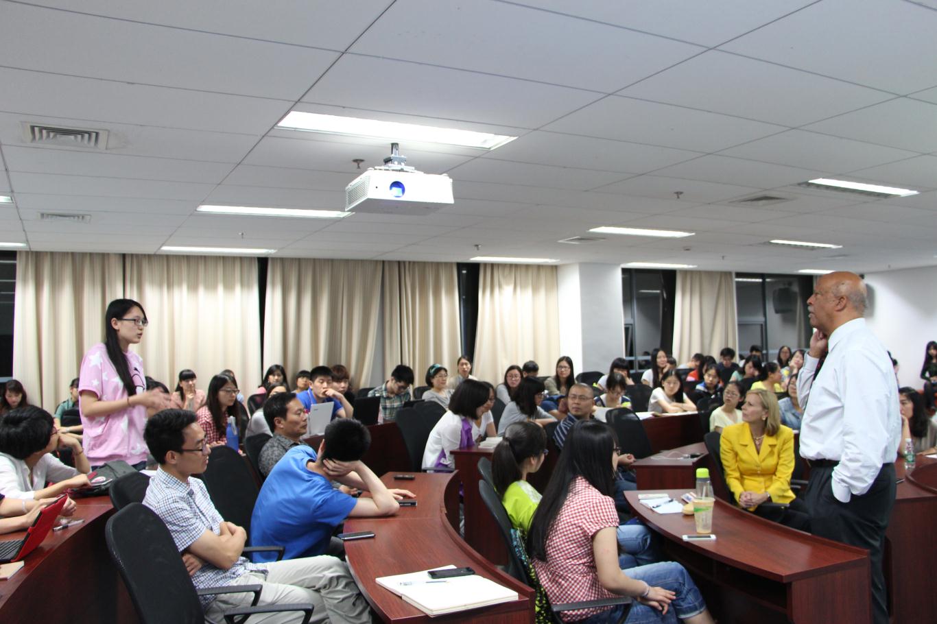 随后,Wilson教授开始了他的演讲。他戴着印有中国古诗“床前明月光”的领带,从自己与中国的邂逅和缘分开始谈起,他说,自从1993年第一次来中国起,他就对中国产生了很大的兴趣,中国的政治与文化特色使其新闻与传播领域不断迸发着引人注意的闪光点。很高兴能够在中国的大学里谈这样一个主题。在目前这个数字时代,许多事物产生了特有的新现象,要想在数字时代获得成功,找到自己的道路,思考在数字时代我们所需要的才能,显得尤为重要。