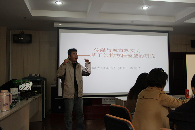 “博士之家学术午餐会”第6期在鼓楼校区费彝民楼A座418室举行。此次午餐会邀请到了上海大学影视学院新闻传播系副教授、上海大学媒介与青年文化研究中心主任陶建杰博士,为老师和同学们做了题为“传媒与城市软实力——基于结构方程模型的研究”的学术报告。本次讲座由郑欣教授主持,王辰瑶副教授、朱丽丽副教授、付晓燕老师,和近四十名来自院内外的硕博研究生们参加了这次讲座和讨论。