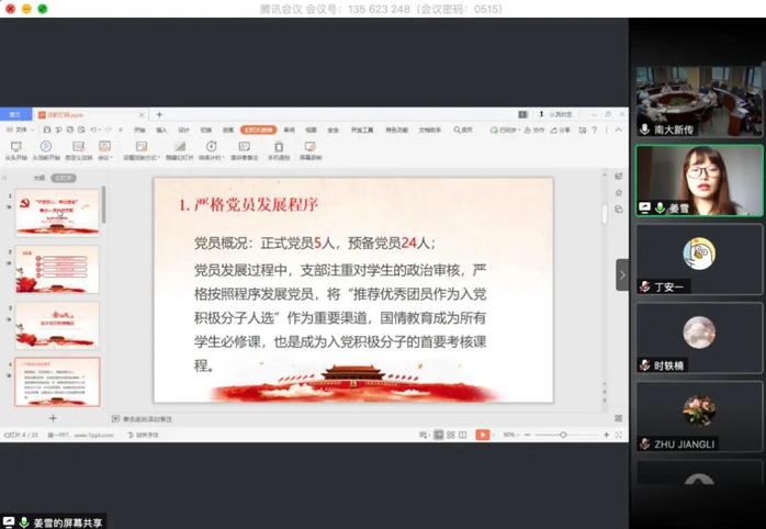 2019级专硕党支部书记时轶楠从党员学习教育、制度执行、班子建设及作用发挥四个方面对支部主要工作进行汇报,支部在理论学习、实地参观、创新党建项目方面重点推进。