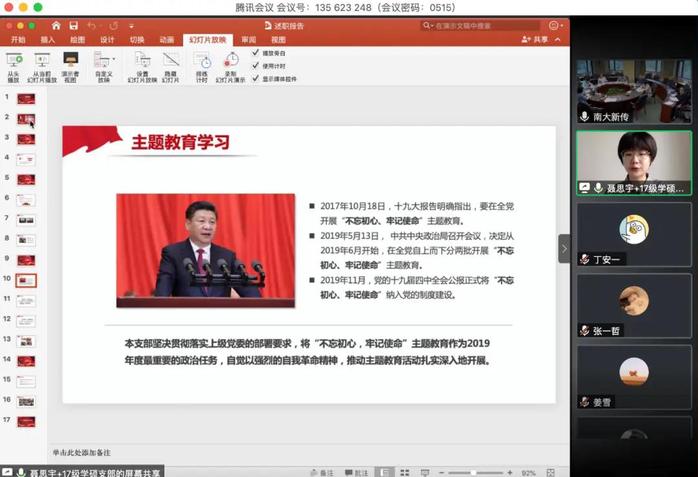 2017级学硕支部书记聂思宇着重介绍了支部落实“三会一课”制度、贯彻“不忘初心、牢记使命”主题教育的相关活动,也提出目前存在的困难和问题。