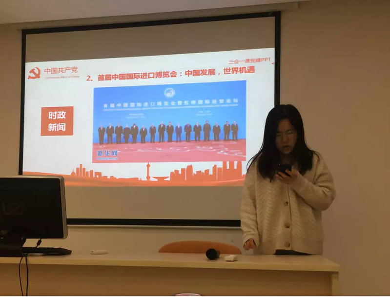 首先会议上对11月13日,党和国家领导人习近平、栗战书、汪洋等在国家博物馆参观“伟大的变革——庆祝改革开放40周年大型展览”的新闻进行了一个回顾。接着,又对首届中国国际进口博览会11月5日在上海开幕事件进行了一个了解。其中,樊琨同学和房夏莲同学分别对两条时政新闻做了一个细致的分析也谈了自己对于新闻事件的一些感想。其他参会党员同学也就时政新闻内容展开了讨论学习。