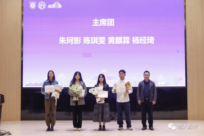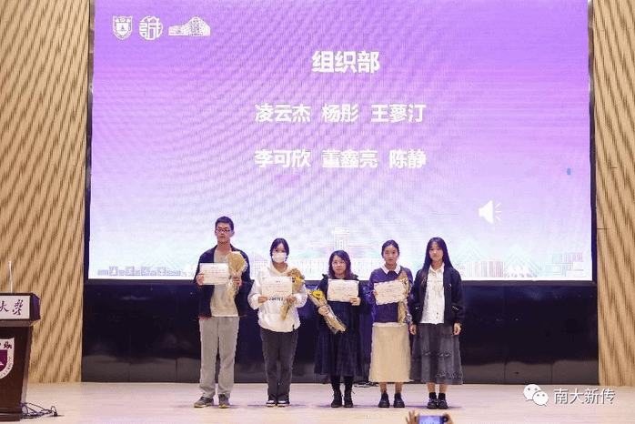 2021-2022年度团学联主席团成员朱珂影、杨经琦以及学生团委副书记陈琪雯为团学联的每一位成员颁发工作证明和鲜花。吴平老师为2021-2022年度主席团成员颁奖,表达对同学们一年来辛勤工作的感谢和未来的祝福。