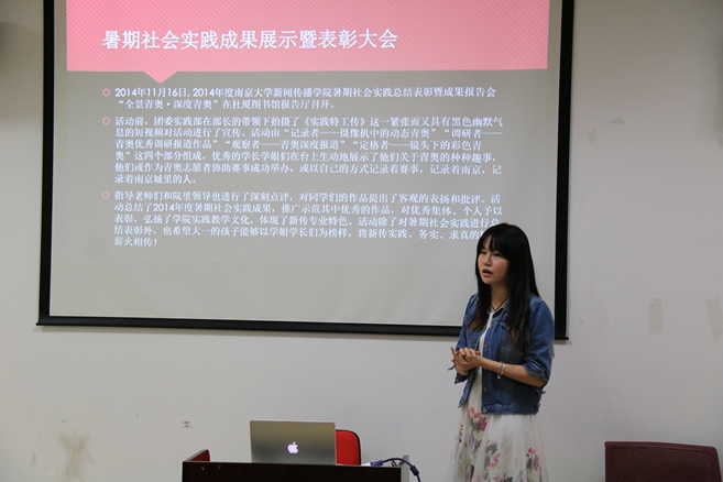 院团委组织部长武涛介绍了团委的工作情况,他首先介绍了部门情况及分工,然后从团委宗旨“对外高举红旗、对内服务同学”重点谈起,以具体活动为例子阐释如何实现宗旨,最后谈到团委重点培养的项目——刚刚起步的“新声”微信公号。武涛又大体介绍了学院的组织情况,将离同学们最近的组织分为三类,概要地介绍了学院以团学组织举办活动、专业实践补充课堂、基层团支部服务同学们的架构。团委实践部长马雨薇号称“霸道总裁”,她以风趣的语言介绍了实践晚会的全过程,贡献出很多干货,部门的和谐氛围也让大家开怀大笑。