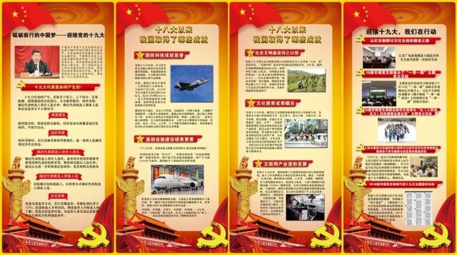 展板设有四块,分为三个部分。第一块展板为第一部分,以一张长图解读了十九大代表的产生过程,包括推荐提名、组织考察、确定代表候选人初步人选名单、确定代表候选人预备人选和会议选举等五个主要环节,向同学们普及了会议流程与基本知识。第二、三块展板为第二部分,回顾了我国在十八大以来所取得的各类成就。五年来,在以习近平同志为核心的党中央的领导下,全国各族人民团结奋斗,在国防科技、基础设施建设、互联网产业、生态文明建设、文化教育等诸多领域取得了累累硕果。第四块展板为第三部分,梳理了学院各党支部举办的以文化自信、“一带一路”等党的十八大以来关键词为主题的活动。