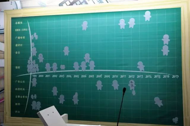 杜院长的背后是一块坐标板,以年份为横轴,以职业为纵轴。95级新闻系的25位同学挨个把自己这些年重要的人生节点用人形贴纸标记在坐标板上,勾勒出一条条或相交,或分离的人生轨迹。