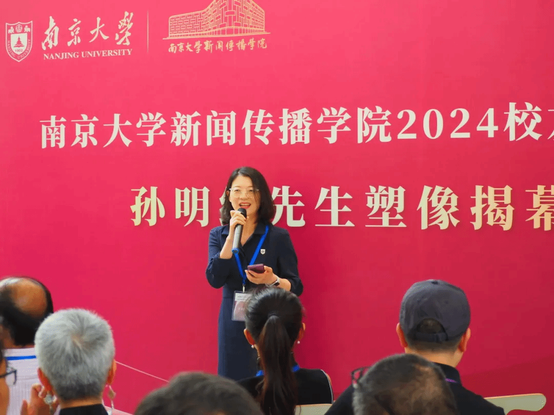 四位不同年代入学的校友代表——80年代凌曦、90年代柴继军、00年代戴韫、10年代李攀,一同为孙明经先生雕像揭幕。铜色的雕像从此坐落学院中央,作为学院的新标志,将永远纪念孙明经先生为新闻传播事业做出的杰出贡献,激励全体师生赓续传统,砥砺奋进。