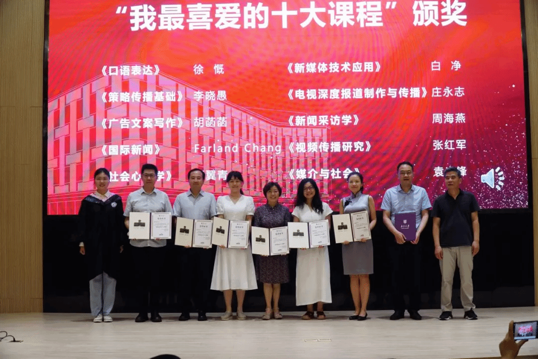 在“我最喜爱的十大课程”颁奖环节,口语表达、新媒体技术应用、策略传播基础等十门课程脱颖而出,任课教师上台领奖。不仅课程名单经过广泛投票和推选,每一个颁奖词也是汇总了同学们的心声:口语表达课程中“一次次电话采访、故事讲述、视频拍摄,让同学们化身校园小记者,面对镜头挑战自己、突破自己。”新媒体技术应用课程上同学们“在温柔、开放、包容的课堂氛围中,不断精进自己的新媒体技能。”新闻采访学课程让同学们“在一个个案例中坚定新闻理想,要自信但不自骄,谦和但不谦卑,会妥协但不软弱,必要时咆哮出声”……陈玉申教授和毕业生代表刘雨辰同学为获奖老师颁发荣誉证书。