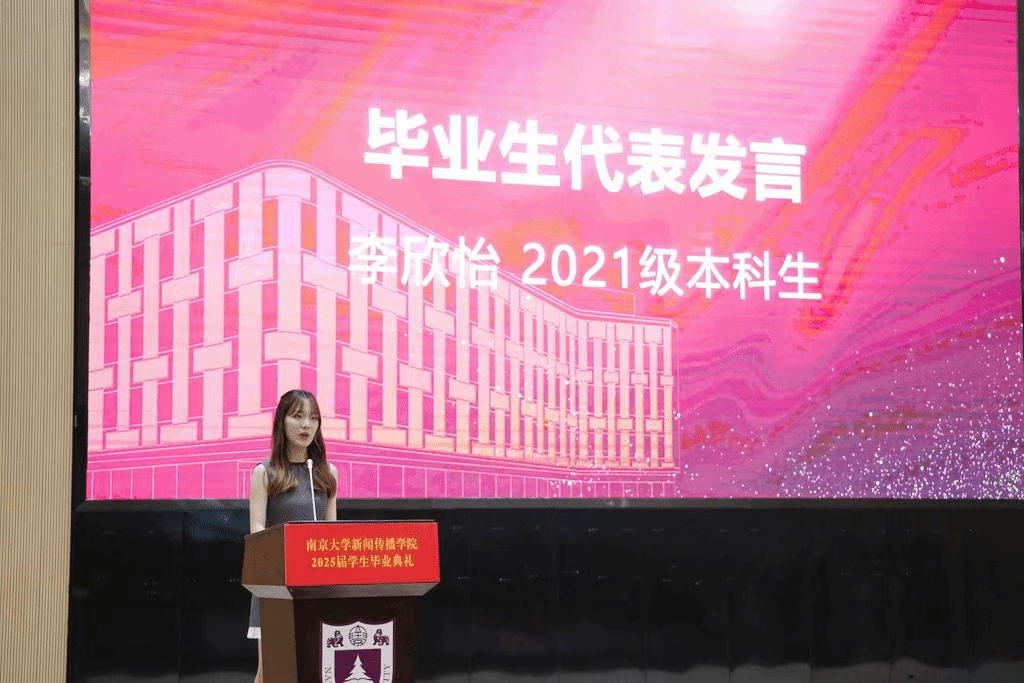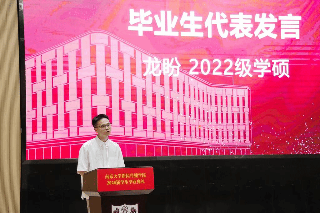 自信、勇敢、务实,研究生代表、2022级学硕龙盼将在南大新传求学旅途中的所知所获凝练为这样三个关键词,他表示,学院赋予了学生专业淬炼的底气,从甄别真伪、挖掘真相的方法论训练,到敬畏真知、坚守责任的价值观塑造,都是直面未来的坚固基石;滋养出坚守理想的勇气,有学术冷板凳的孤寂,也有新闻实践的落差,但从未动摇初心。面向未来,他呼吁同学们保持清醒的自我认知,在众生喧哗中做一个有判断力的新传人,探索自己的能力边界。
