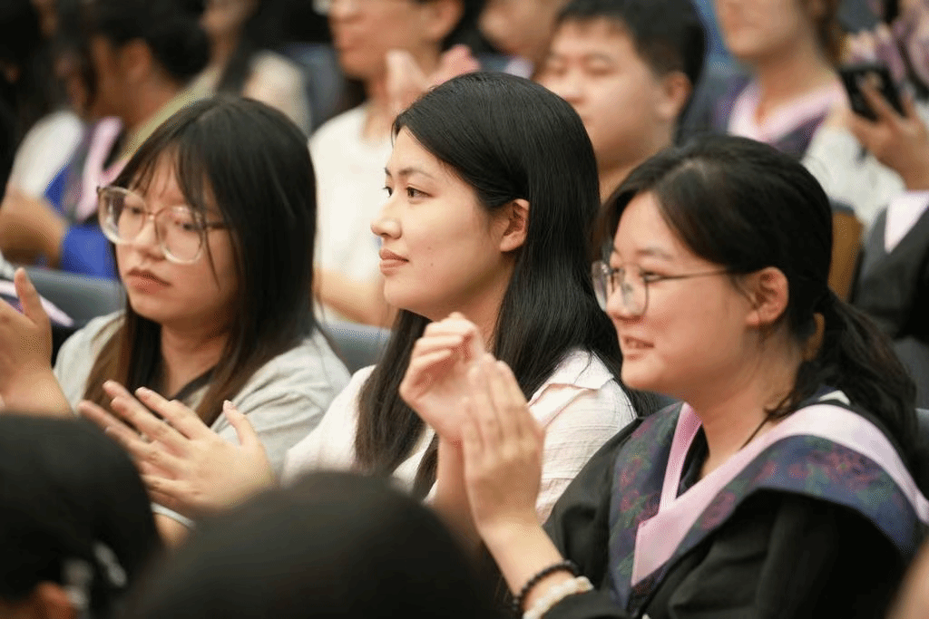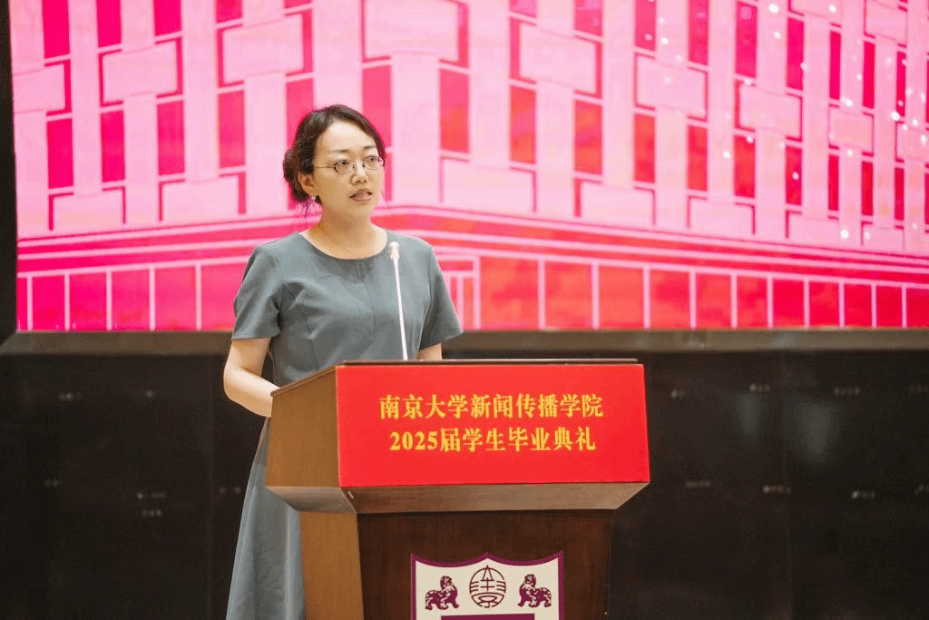 在AI等新技术的挑战下,人文学科的学生们也许正多多少少地面临着一些价值危机,教师代表朱江丽老师以学姐和老师的双重身份,与毕业生同学们共情在时代浪潮中的个人选择。她以“水”为喻,向同学们讲述了在这个“文化疲惫”的时代,何为人文学科的价值——“提醒人们看见看不见的东西”。面对即将奔赴四面八方的毕业生们,她抛出了三个直指本心的坐标之问: