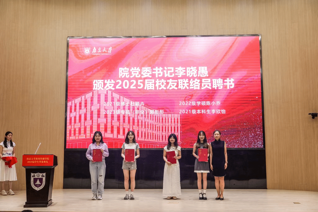 为进一步做好校友工作,学院从2025届毕业生中选聘4位校友联络员,院党委书记李晓愚为他们颁发校友联络员聘书。