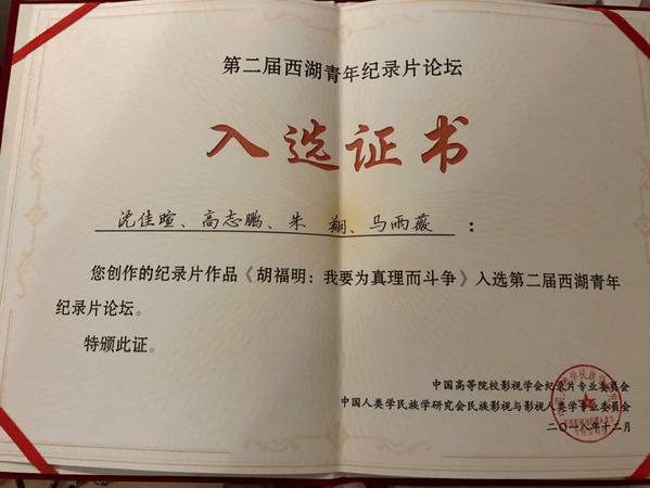 (学生作品《胡福明:我要为真理而斗争》入选证书)