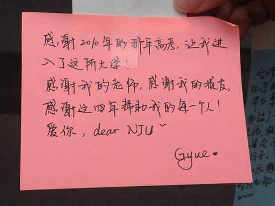 大四的毕业生们也在这里留下了对母校的祝福,对学弟学妹的寄语。感恩是出现最多的字眼,感谢学校,“感谢南大让我成长,在青春的岁月,留下最动人的回忆。”感谢父母,“包容我,施我以爱”,感谢朋友,“感谢四年来舍友们、小伙伴们的陪伴,未来的路上虽不能携手并肩,但这份情意会一路相伴”,感谢经历,“感谢四年中经历的一切酸甜苦辣,我相信大学四年会在我身上打上一生难以磨灭的印记。大哉一诚天下动,如鼎三足兮,曰知、曰仁、曰勇。”每一个字记录的都是心底最深刻的表达,每一笔写下的都是他们最真挚的情感。