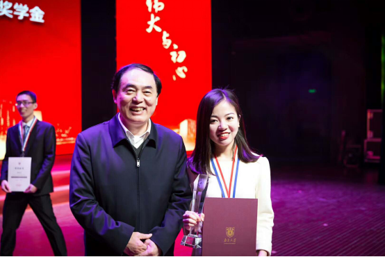 2014级本科生徐妙作为学生年度人物和栋梁特等奖学金的双料获得者,从陈骏校长手中接过了奖杯和奖牌。