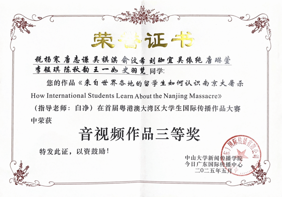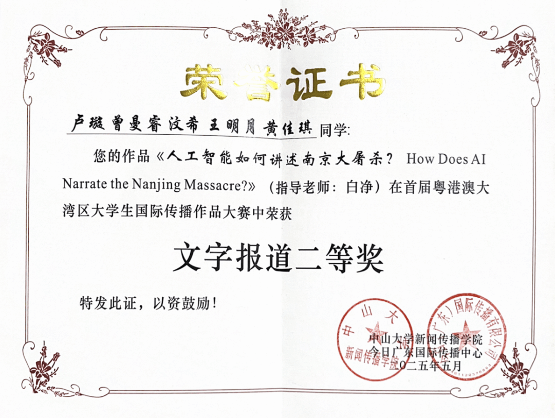 大赛吸引了来自全国(含港澳)33所高校共206支队伍积极参与,收到近250份作品投稿。经22名专业评委严格筛选和评审,最终评选出一二三等奖共50件获奖作品,我校学生作品《人工智能如何讲述南京大屠杀?How Does AI Narrate the Nanjing Massacre?》获得文字报道二等奖,《来自世界各地的留学生如何认识南京大屠杀How International Students Learn About the Nanjing Massacre》获音视频作品三等奖。