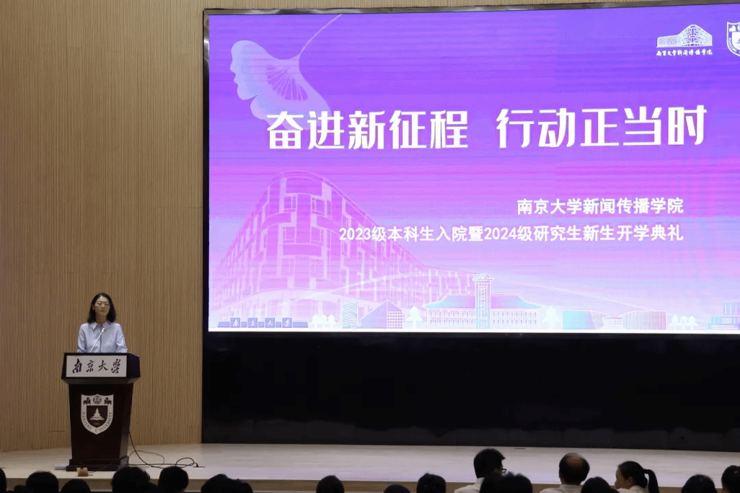 教师代表、副院长李晓愚教授致辞,祝贺同学们迈入人生新旅程,成为了一名南大新传人。从“年年岁岁花相似,岁岁年年人不同”说起,她与同学们交流了“什么是成长”这一核心问题。以自己的奋斗体会为例,她激励新生不断积淀自我,锻造成才、成功的过硬本领,享受成长过程的纯粹快乐。同时,她希望大家在南大这所综合性大学“永远保持探索的好奇心”,积累多元化的思维工具,从容应对世界。此外,也要坚持独立思考和判断,追求真理,把失败转变为成长的动力。最后,李晓愚祝福大家在和时光赛跑的过程中,可以有“苟日新,日日新,又日新”的变化和成长。