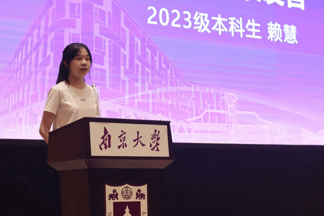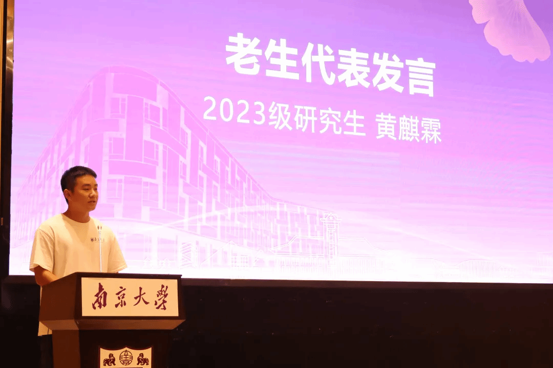 2019级本科毕业生、2023级在读硕士研究生黄麒霖同学代表老生发言,他回顾了自己五年来在南大新传的成长经历。他相信,依托学院即媒体的教学理念和丰厚的学术资源,大家在新闻实务或学术研究上都能学有所成。他还分享了看到附近、洞察远方、定位自我的成长感悟,鼓励大家扎根时代的田野,把调查研究和学术论文写在祖国大地,耕耘出自洽的花园。