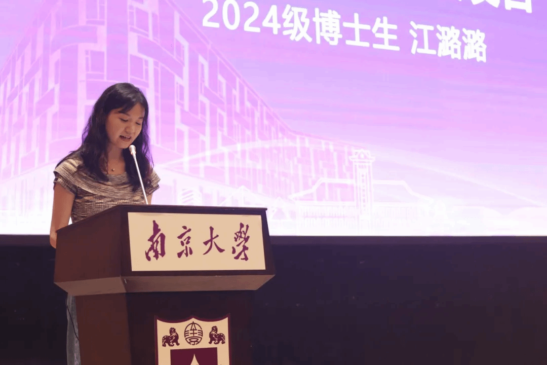 2024级博士生江潞潞代表研究生新生发言。她回顾了硕士阶段在南大新传的学习时光。她以享受交流希望三个关键词和同学们共勉。成长是一种长期主义,通过实实在在的努力可以开发出对自我的认定,并在参与学科建设的点滴实践中,戒掉小情绪,清晰大方向,珍惜正导向,感受空前的清澈。凭借南大人的善良、行动和嚼得菜根的韧劲儿,收获一片灿烂的天空。